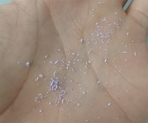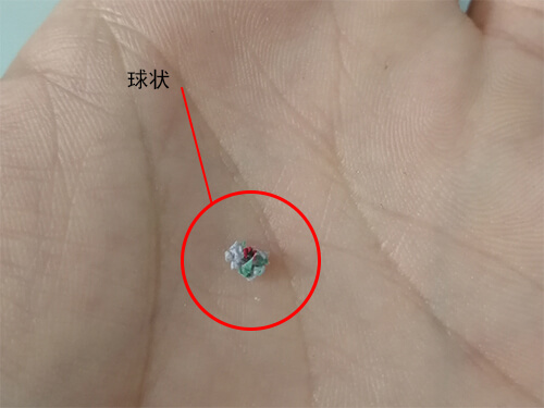 佳润 JR1A(绿桶) 产品外包装采用特殊印刷工艺,因此采用利器,如钥匙或起子等刮削桶表面油漆层,刮削的油漆层呈条状,用手搓捏后,手感有弹性,并呈球状,如图5所示;
