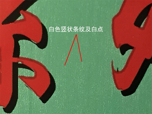 而对于高仿JR1A(绿桶)产品 (外观和我厂产品相近) ,则需要通过下面的细微观察方法进行鉴别。 佳润 JR1A(绿桶) 产品外包装采用特殊印刷工艺,印刷的彩桶表面肉眼仔细观察,某些区域尤其是有色块的区域可见比较明显的竖状白色条纹及白点如图3所示。如采用手机放大拍摄,而后再对拍摄照片进行放大,此白色条纹及白点将更加明显。