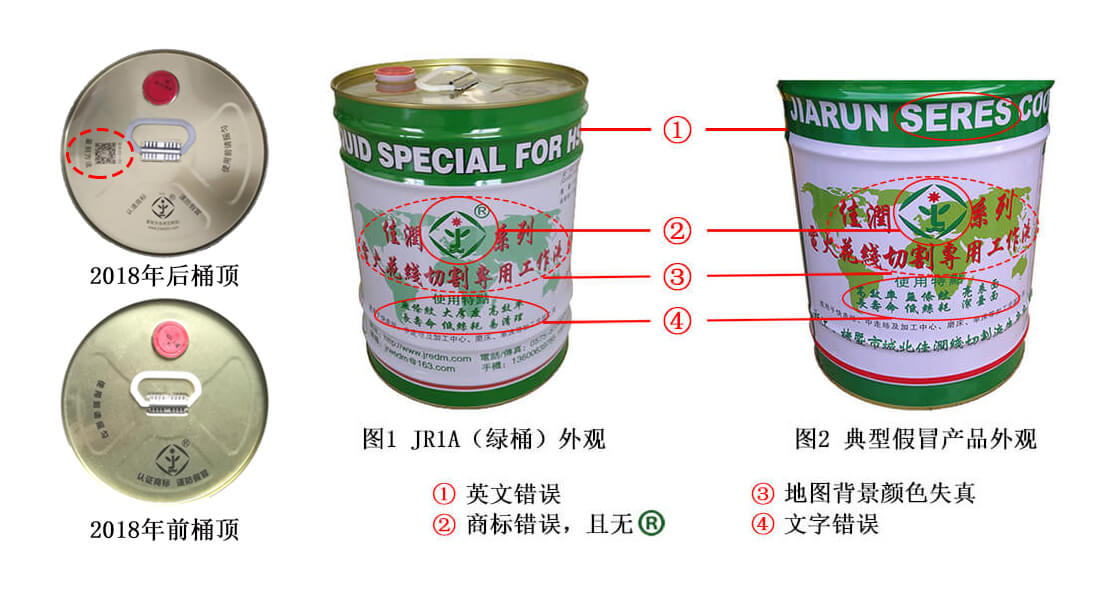 近年不断发现有人假冒我厂名义在网上销售所谓的 JR1A(绿桶) 型“佳润系列工作液”,同时也发现市面上出现多种仿冒我公司 JR1A(绿桶) 外观包装的产品,为保护广大佳润新老客户的切身利益,佳润线切割液生产厂特别对 JR1A(绿桶) 产品外包装进行设计、生产升级,现将 JR1A(绿桶) 产品外包装的鉴别方法告知广大佳润客户,以便进行初步鉴别:
